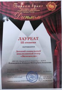 Поздравляем Детский социальный инклюзивный театр «Мечтатели» с победой в конкурсе студенческих и любительских театров России «Бархат кулис» (г. ОРЕЛ).